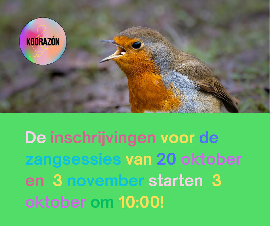 De inschrijvingen voor onze volgende zangsessie op 20 oktober en 3 november starten morgen, vrijdag 03/10 om 10:00, via onze website.